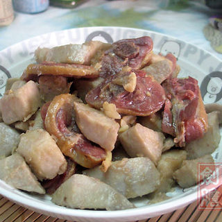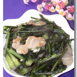 原料:紫菜苔、蒜末儿、腊肉、盐。