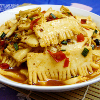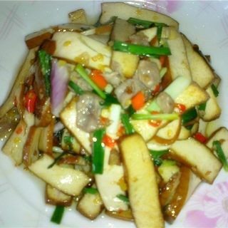 原料:湘式五香豆腐、大蒜苖、辣椒、肉、油、盐、味精、老抽。