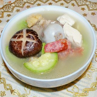 原料:猪骨、葫芦瓜、泡发香菇、咸鱼、腊肠、冻豆腐、姜片、葱。