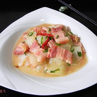 原料:白菜帮子、咸肉、油、盐、料酒、鸡精、葱、姜、蒜、辣椒、水淀粉。