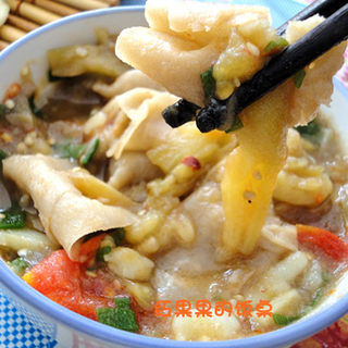 原料:面粉、蒜苗、包菜叶、温水、食盐、鸡精、酱油、醋、干辣椒面、食用油。