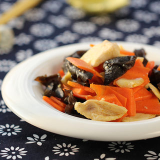原料:红萝卜、鸡脯肉、木耳、蛋清。