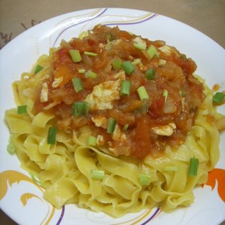原料:豆腐、蕃茄、洋葱、葱、大葱、盐、生抽、糖、老抽。