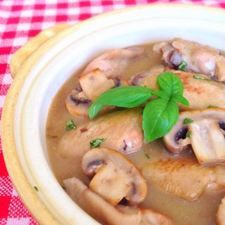原料:鸡翅、蘑菇、洋葱碎、香菜叶、葱、盐、黄油、蔬菜油、奶油、生粉。