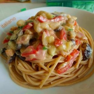 原料:全麦意面、培根、红椒、洋葱、蘑菇、西葫芦、牛奶、芝士意面料粉、黑胡椒碎。