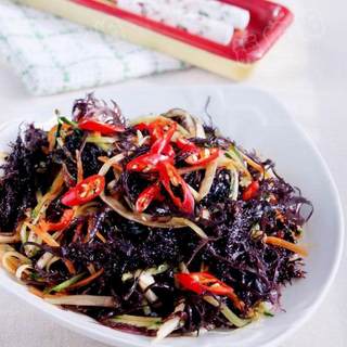 原料:紫晶藻、白菜、胡萝卜、黄瓜、小红椒、辣椒油、醋、香油、生抽、味精、糖。