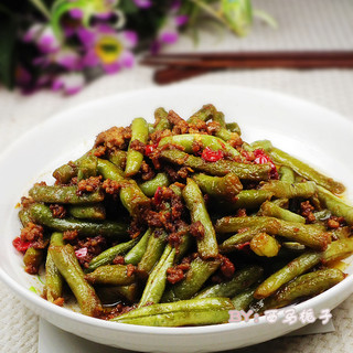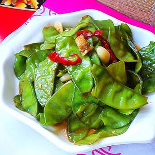 原料:扁豆、葱姜蒜、红辣椒、、料酒、生抽、白糖、淀粉、油、盐、味精、(适量)。