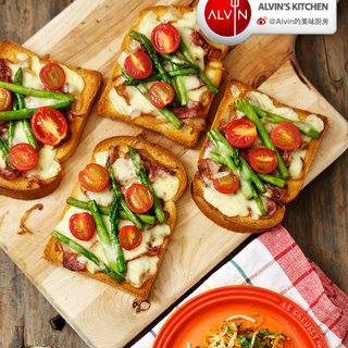 原料:土司、芝士奶酪、洋葱、樱桃番茄、芦笋、培根、胡萝卜、金针菇、蒜茸、香菜。