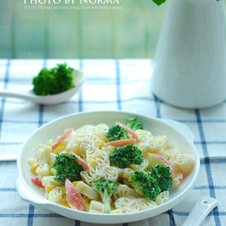原料:通心粉、原味酸奶、西蓝花、玉米、苹果、橄榄油、盐。