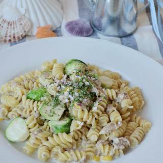 原料:淡奶油、吞拿鱼、意面、球芽甘蓝、玉米、盐、黑胡椒。