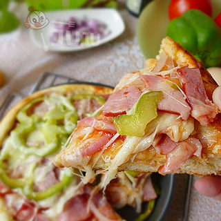 原料:高筋面粉、酵母粉、火腿、培根、马苏里拉奶酪、鸡蛋、洋葱、青菜椒、糖、盐、橄榄油、番茄酱。