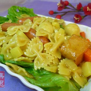 原料:意大利蝴蝶面、洋葱头、小土豆、胡萝卜、生菜、各式丸子、牛奶、咖喱粉、盐、糖、水淀粉。