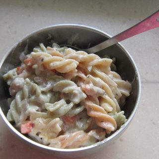 原料:三色螺丝意面 、黄油、面粉 、牛奶 、洋葱、胡萝卜、自制肉饼 、盐、鸡精 。