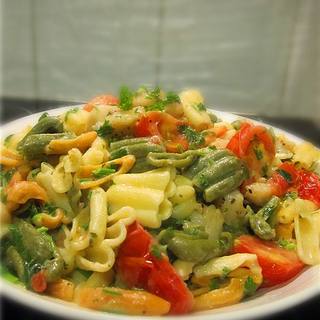 原料:意大利蚬壳粉、蜂蜜味脆皮肠、樱桃番茄、橄榄油、红酒醋、研磨胡椒、薄荷叶。