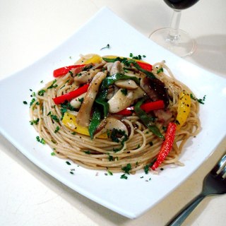 原料:细条干意面、松茸菌、培根、红黄彩椒、扁豆、大蒜、胡椒汁、盐、橄榄油、香草碎、黑胡椒碎、鲜罗勒碎。