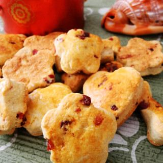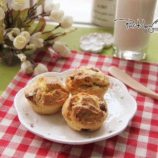 原料:低筋面粉、奶粉、黄油、细砂糖、鸡蛋、牛奶、淡奶油、泡打粉、盐、香草精、酒渍蔓越莓。