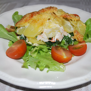 原料:菠菜、虾仁、土豆、鸡蛋、牛奶、面粉、芝士粉、盐、黑胡椒粉。