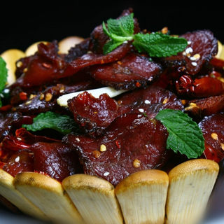 原料:牛肉干巴、干辣椒、姜、薄荷。