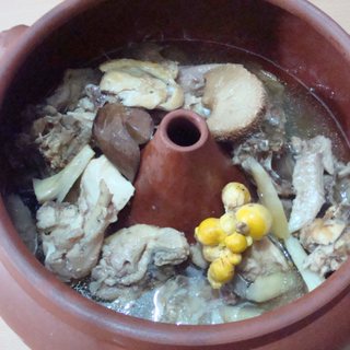 原料:老母鸡、各种菌菇、盐、料酒、姜。