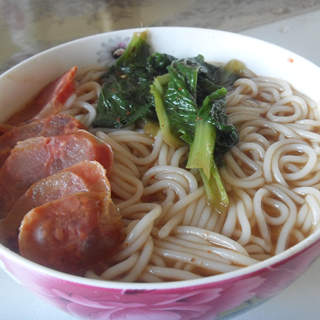 原料:云南细米线、昭通酱、菌粉、沾水、腊肠、小白菜。