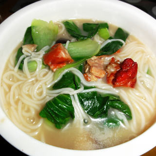 原料:过桥米线、瘦肉片、基围虾尾、小墨斗鱼、鸡蛋、青蒜、上海青、盐、芝麻油。