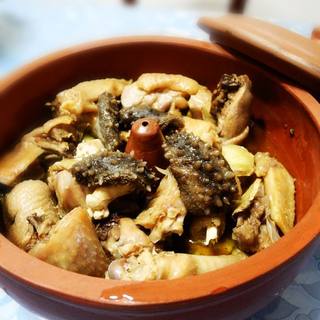 原料:公鸡、海参、葱、姜、盐、白胡椒粉。