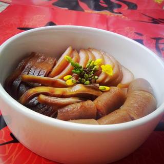 原料:咸猪头肉、黄豆、料酒、八角、桂皮、姜、葱、鸡精。