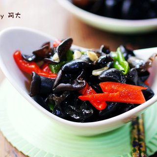 原料:黑木耳、青红椒、油、盐、蒜末、鸡精、水淀粉。