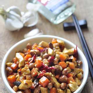 原料:鸡胸肉、花生米、胡萝卜、干红椒、料酒、淀粉、味好美宫保鸡丁调料。