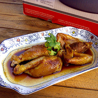 原料:鸡、姜片、丁香、草果、香叶、油、茶叶、粗沙糖、盐、糖、玫瑰露酒、米酒、鸡粉、酱油、鱼露。