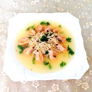 原料:豆腐皮、北极虾、虾皮、香菜、鸡汤、蒜、姜、盐、香油、鸡汁。