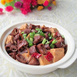 原料:肥肠、豆腐、植物油、盐、酱油、姜、辣皮子、八角、白寇、鸡精、味级鲜、冰糖、蒜苗。