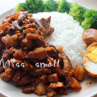 原料:五花肉、猪皮、干香菇、桂皮、八角、油葱酥、蒜末、干辣椒、酱油、酱油膏、米酒、白胡椒粉、冰糖、猪皮高汤。