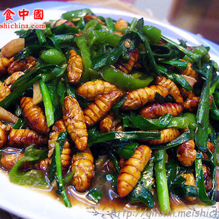 原料:蚕蛹、韭菜、尖椒、姜、蒜、胡椒粉、生抽、盐、鸡精。