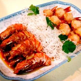 原料:大虾、虾茸、葱丝、姜丝、蒜片、盐、白糖、味精、黄酒、面包糠、粉丝、鸡蛋黄、烹调油。