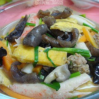 原料:海参、肉馅、炸豆腐干、胡萝卜、蘑菇、木耳、蟹肉棒、葱、姜、盐、酱油、料酒、糖。