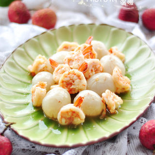 原料:鲜虾、荔枝、料酒、胡椒粉、盐。