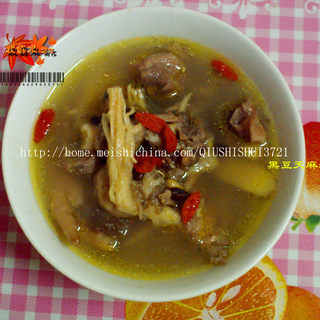 原料:老母鸡、姜片、枸杞、天麻、当归、红枣、黑豆、盐。