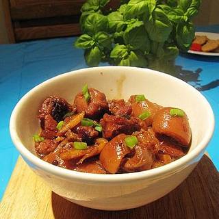 原料:猪蹄、葱、姜片、八角、花椒、油、盐、料酒、生抽、老抽、冰糖。