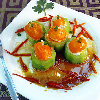 原料:丝瓜、咸蛋、姜、葱粒、蒜、红辣椒、海鲜酱油、辣椒油、色拉油。