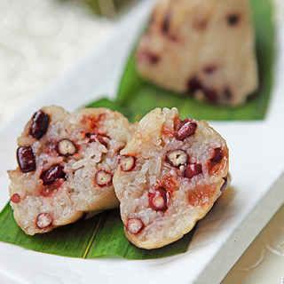 原料:原粒糯米、红小豆、花腰豆、小枣、花生、黑豆、薏仁米、莲子、花豆、粽叶、马莲草。
