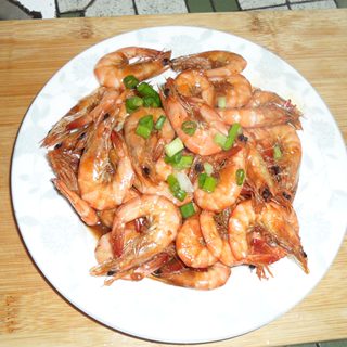 原料:明虾、蒜末、姜、红辣椒、葱花。