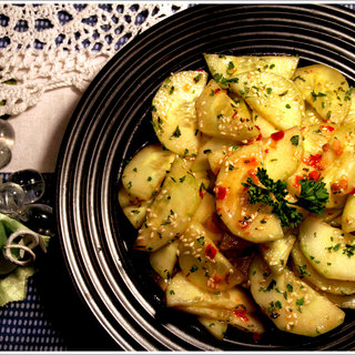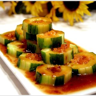 原料:黄瓜、蒜粉、盐、鸡精、香醋、细糖、白熟芝麻、芝麻油、李锦记蒜蓉辣椒酱、干的Parsley碎屑。