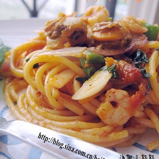 原料:意面、扇贝、五花肉末、虾仁、罗勒、辣椒、大蒜、披萨酱、黄油、洋葱、橄榄油、盐。