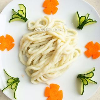 原料:鱼面、莴笋、胡萝卜、葱、盐、虾粉、油。