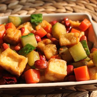 原料:花生米、豆腐、胡萝卜、黄瓜、糖、醋、酱油、料酒、盐、湿淀粉。
