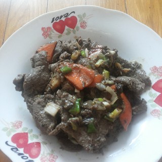 原料:牛肉、胡萝卜、葱、姜、蒜、蛋清、淀粉、朝天椒、大料、盐、酱油、料酒、孜然、花椒面。