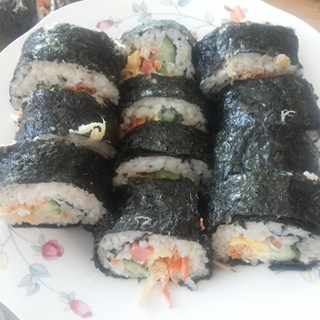 原料:海苔、米饭、芝麻、鸡蛋、胡萝卜、黄瓜、肉松、火腿肠、沙拉酱、糖、醋、盐。