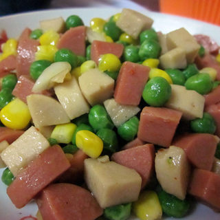 原料:玉米、火腿肠、豌豆、蒜、姜、芝麻油、盐、其他调味料。