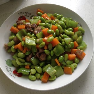 原料:青豆、胡萝卜、瘦肉、青椒、盐、味精、糖。